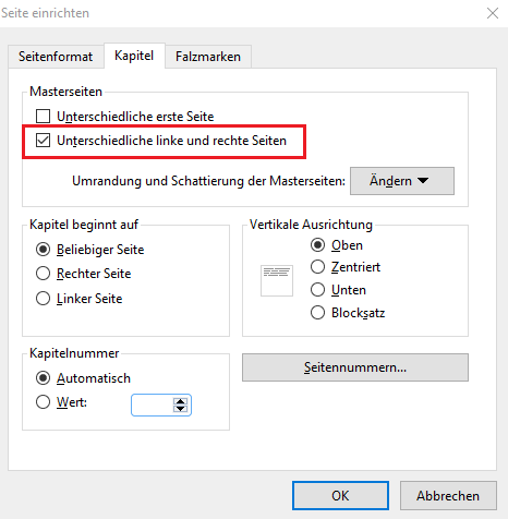 Wenn Seitenzahlen am äußeren Rand der Seiten stehen sollen, rufen Sie Layout | Kapitel auf und setzen unter „Masterseiten“ bei „Unterschiedliche linke und rechte Seiten“ einen Haken: